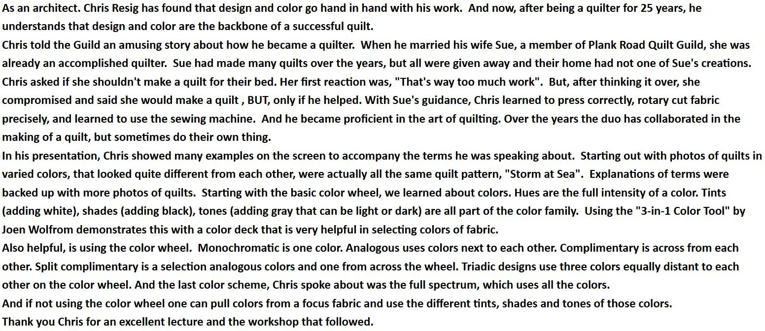 One of our own members, Mary Husted, gave a wonderful presentation on half square triangles. The design elements and various construction methods of the half square triangle were explained. Commercial products to help in construction, such as Triangles on a roll, were reviewed. Mary also showed quilts that demonstrated how half square triangles are used in quilting.